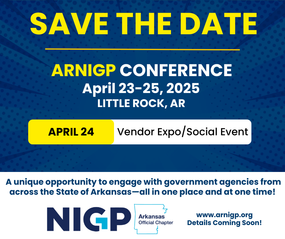 Arkansas Chapter of NIGP (ARNIGP) is a professional association dedicated to providing networking opportunities, professional development, updates on legislation, assistance with attaining professional certifications, and other services to public procurement professionals representing governmental entities, including state, municipalities, counties, higher education, school districts, transit, airports, utilities, and more across the State of Arkansas.